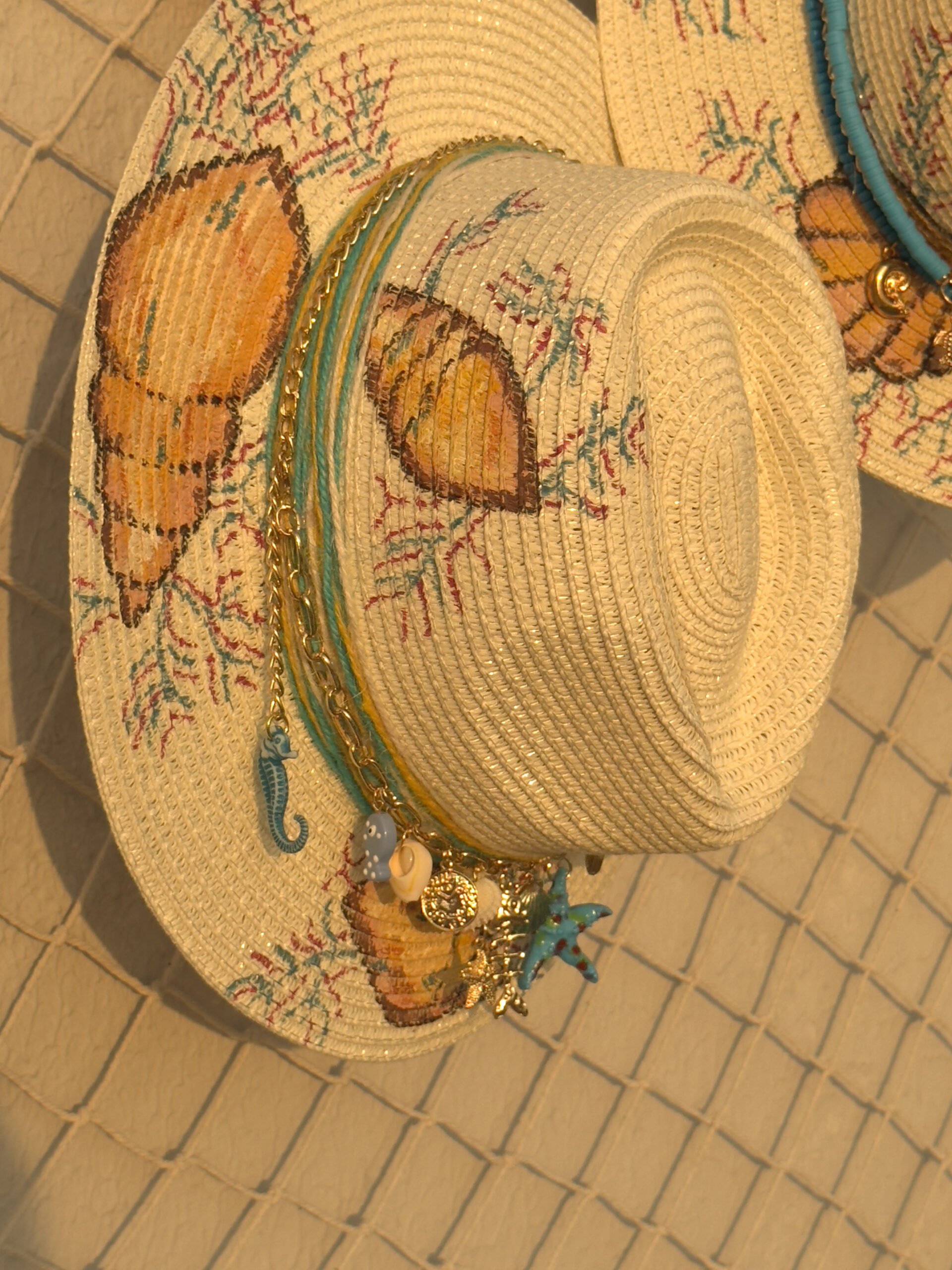 Adorned with natural seashells and personalized with delicate charms, each piece is uniquely designed to reflect your story. Whether you’re strolling along the beach or elevating your summer look, this hat brings a touch of coastal elegance to any outfit.