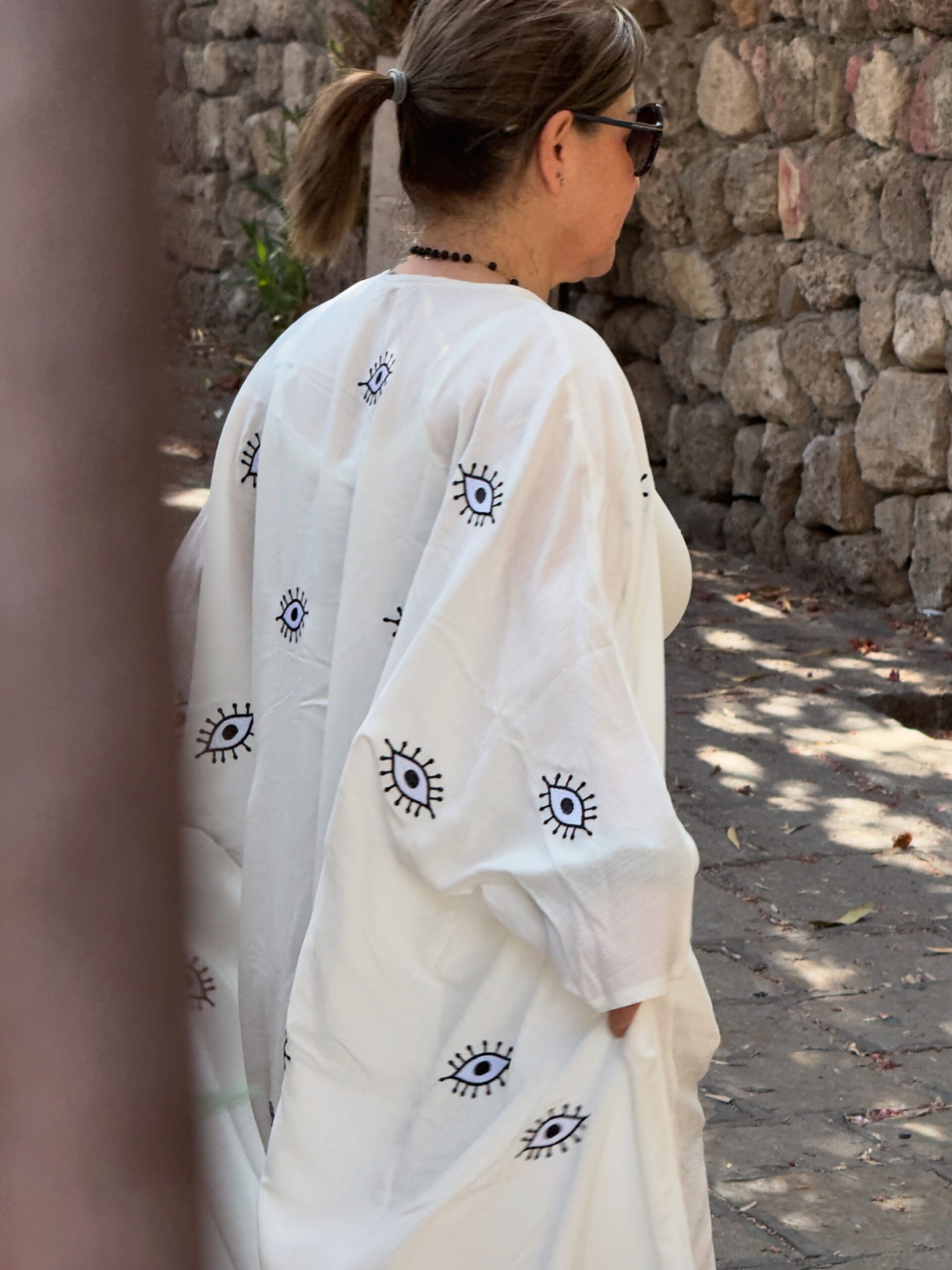 A gentle nod to tradition with a modern twist, this abaya features a delicate small evil eye print—a symbol of protection and spiritual strength. The minimalist design adds a touch of meaning without overpowering the elegance of the silhouette.